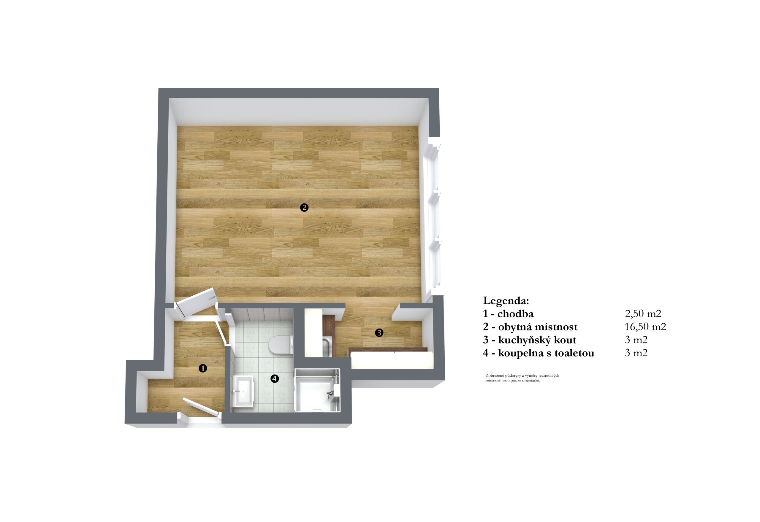 Dispozice: vstupní chodba s nikou, obytná místnost s kuchyňským koutem, koupelna se sprchou a WC.
