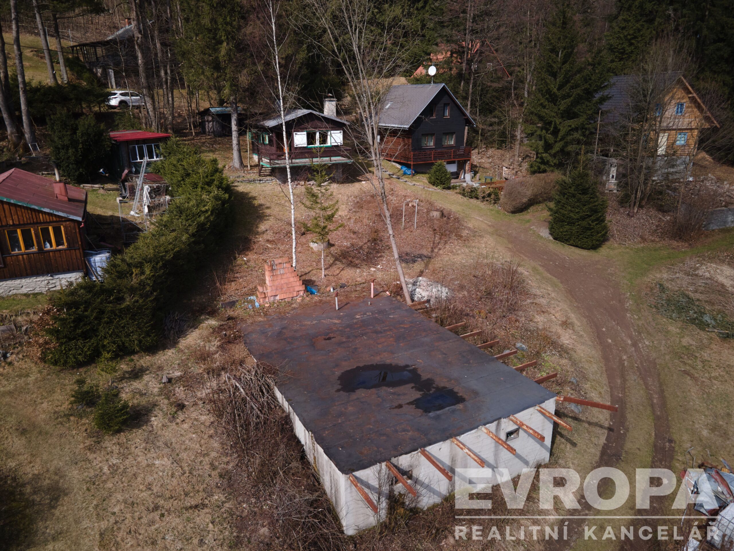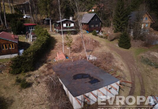 Součástí spodního pozemku je torzo základové desky dříve nepovolené a nechválené stavby původního majitele. Nelze tedy použít na další výstavbu. Tento pozemek může nový majitel použít na výstavbu druhé chalupy, kterou může třeba pronajímat.