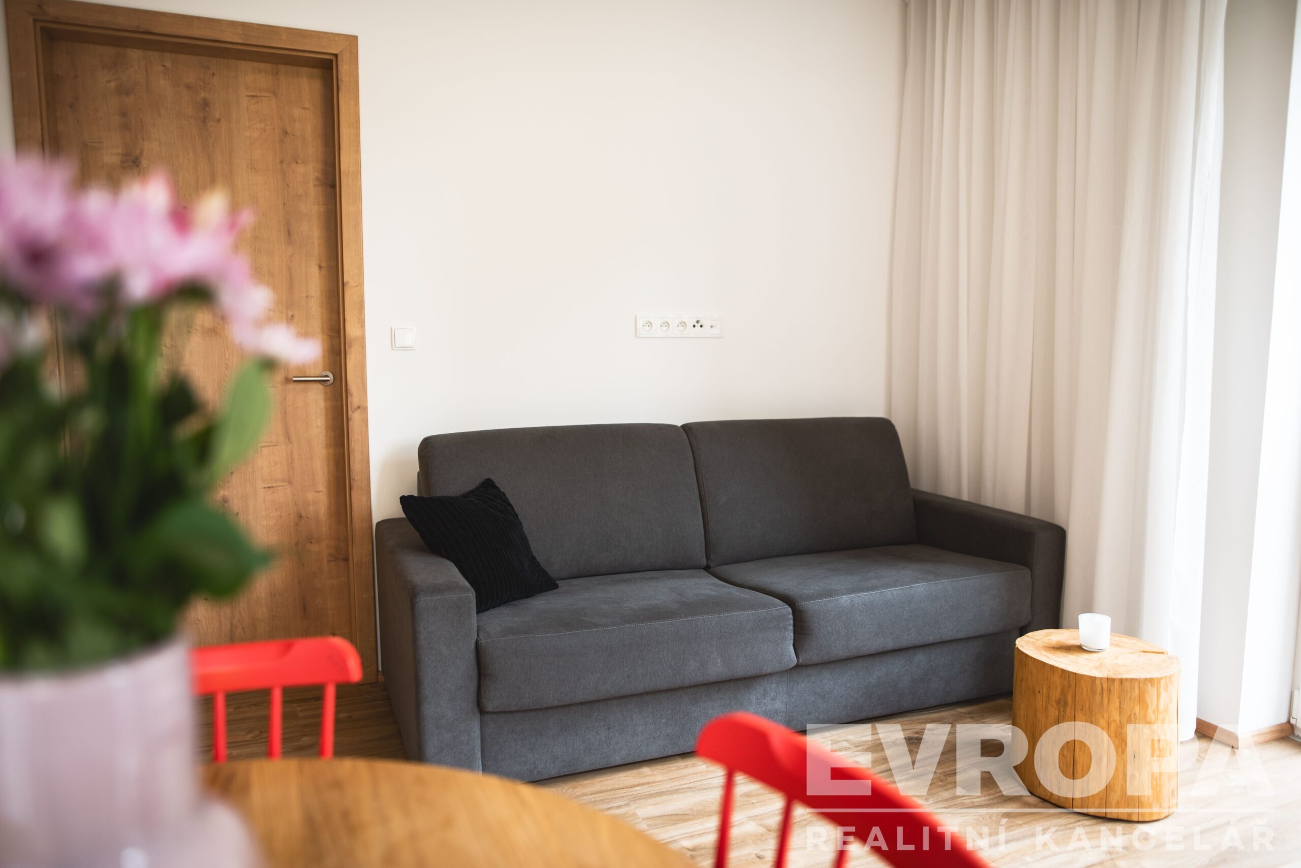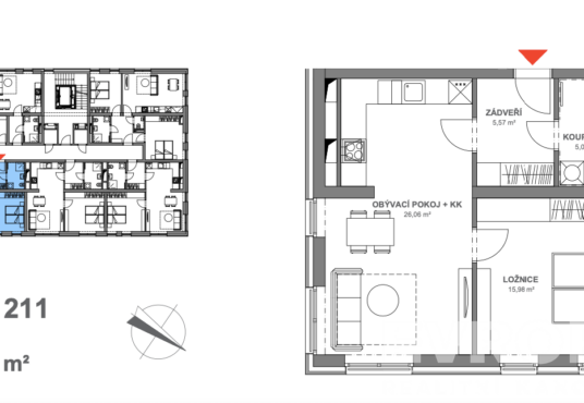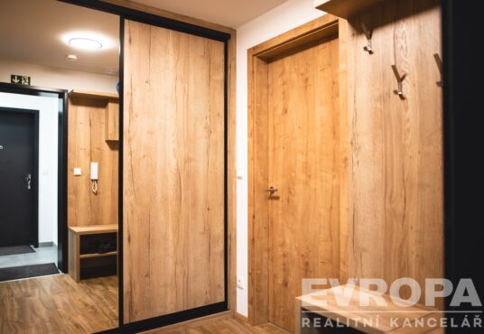 Dispozice: vstupní chodba, obývací pokoj s kuchyní, ložnice a koupelna s WC a sprchovým koutem. K bytu náleží v přízemí bytového domu zamykatelný sklep s háky na kola a vysoušeč bot. Velkou výhodou je také samostatná komora 3 m2 přímo na patře.