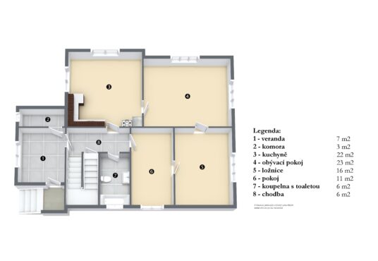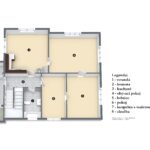 Přízemí: vstupní veranda, špajz, vstupní chodba, kuchyně, obývací pokoj, ložnice, pokoj a koupelna s WC.