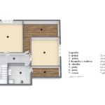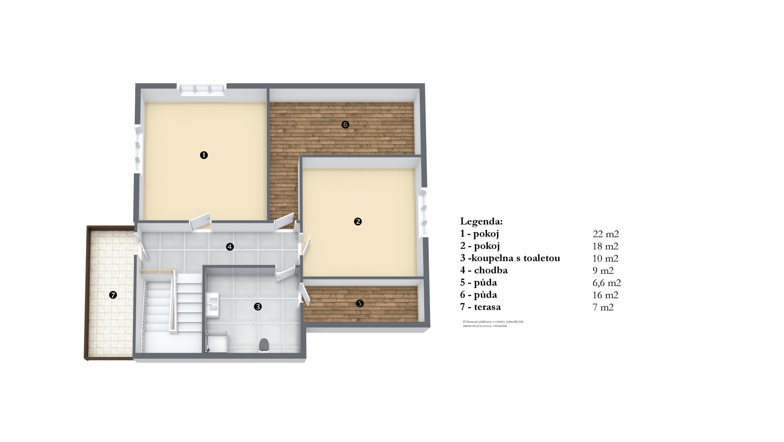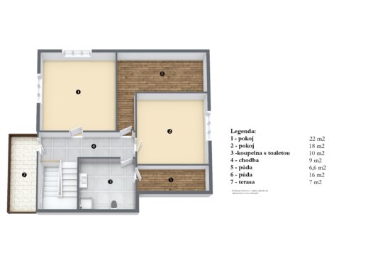 Podkroví: chodba, ložnice, pokoj, koupelna s wc, půda a vstup na venkovní terasu