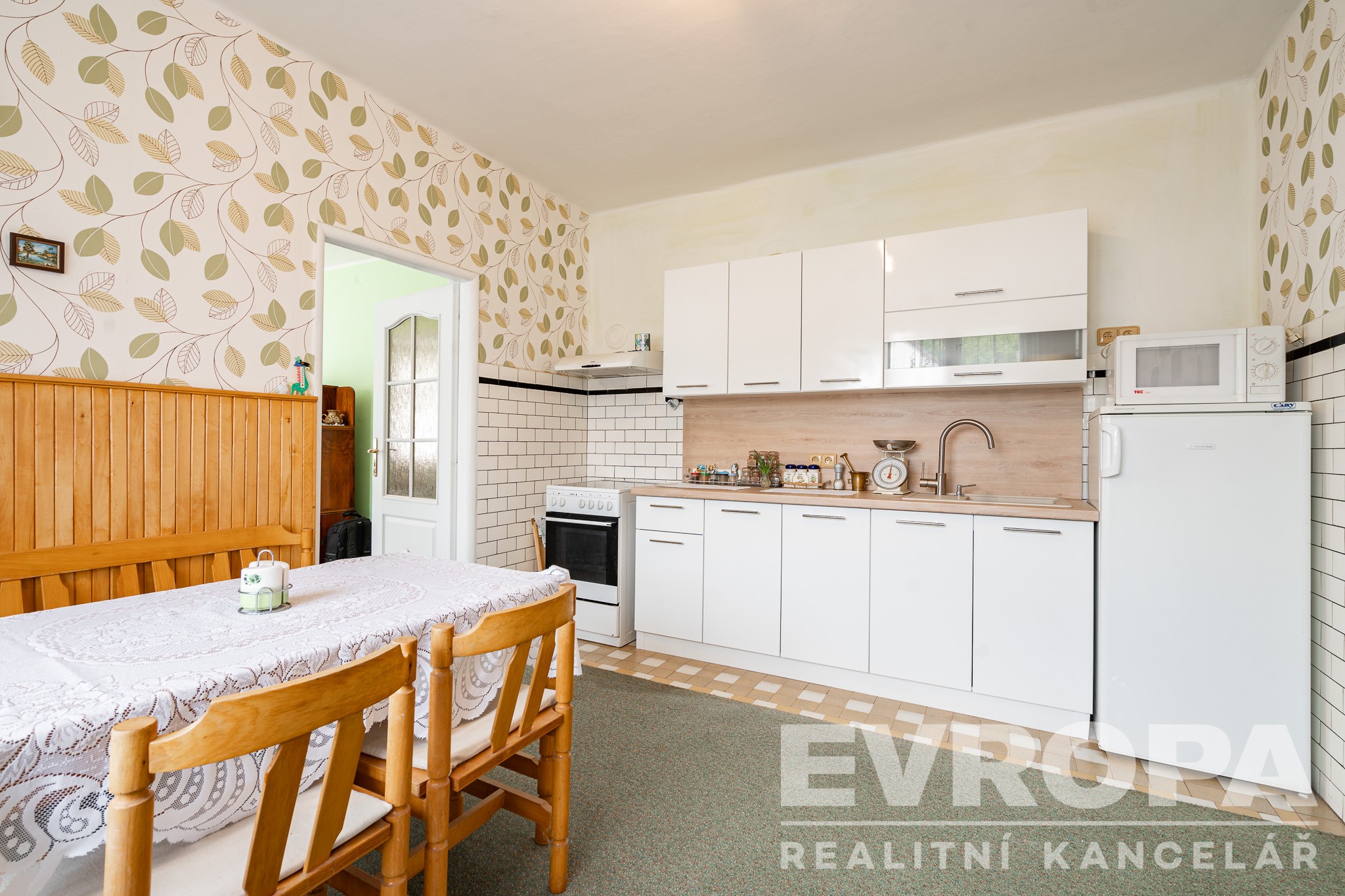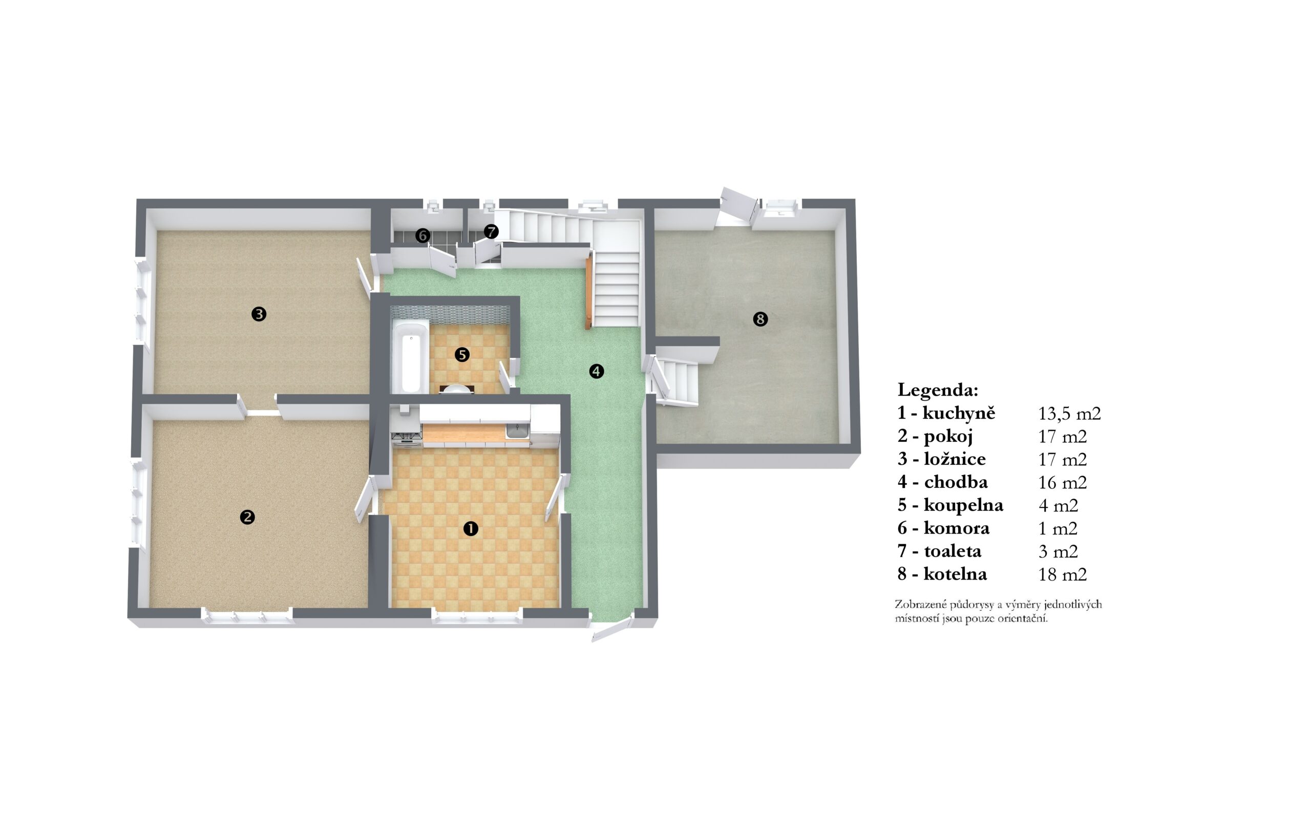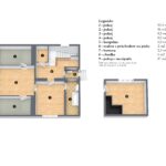 Přízemí: vstupní chodba, kuchyň, obývací pokoj, ložnice, špajz, WC a koupelna s vanou