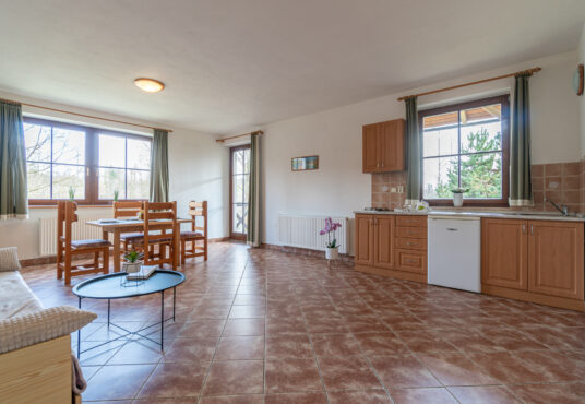 Dispozice: zádveří, chodba, obývací pokoj s kuchyňským koutem a vstupem na prostornou dřevěnou terasu, ložnice, pokoj a koupelna s WC.