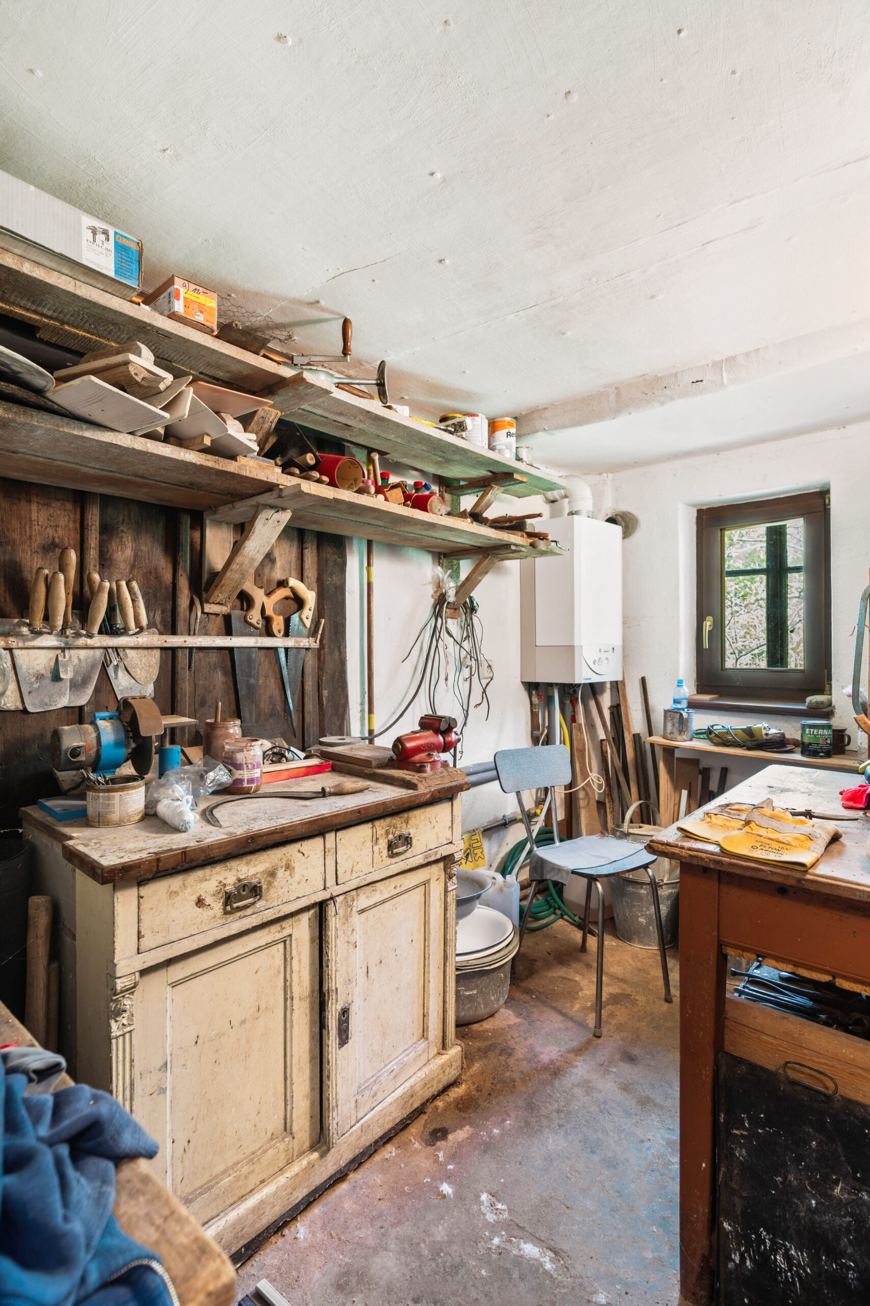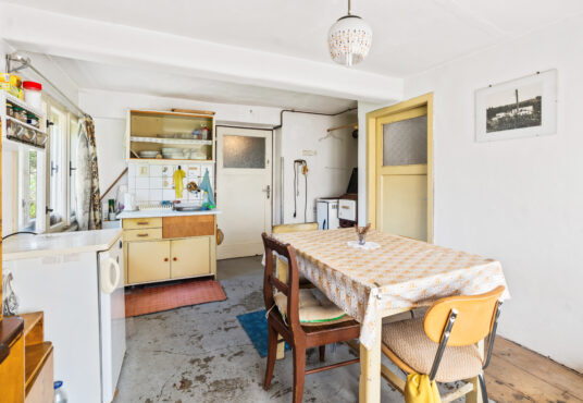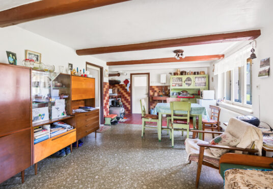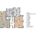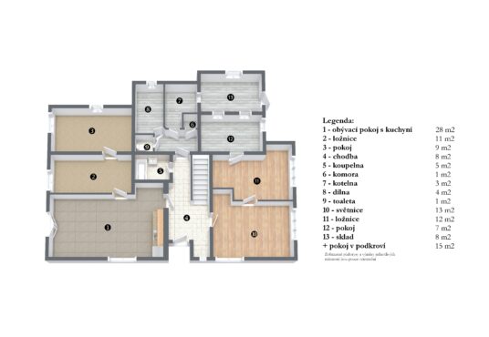 Přízemí: vstupní chodba, obývací pokoj s kuchyní, ložnice, pokoj, koupelna, wc, komora, kotelna, dílna a další 3 místnosti v pravé části chalupy