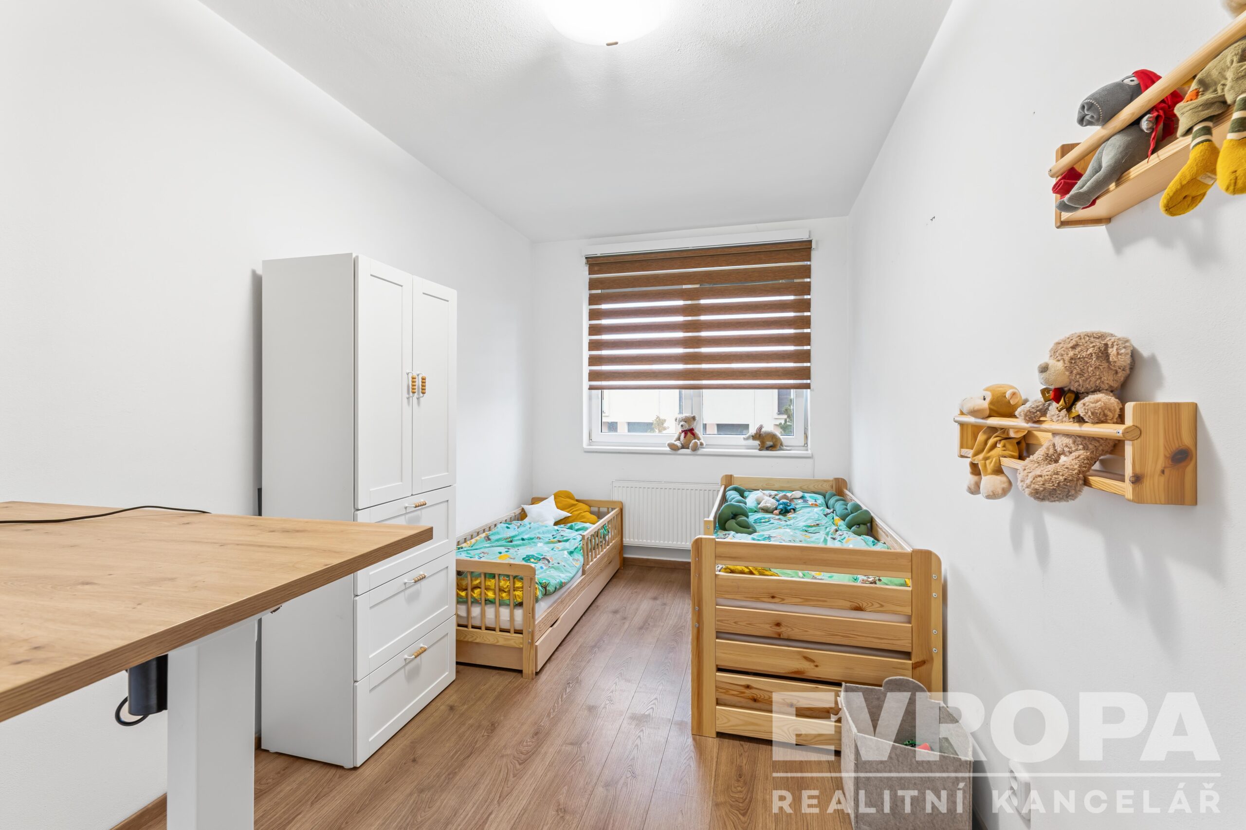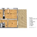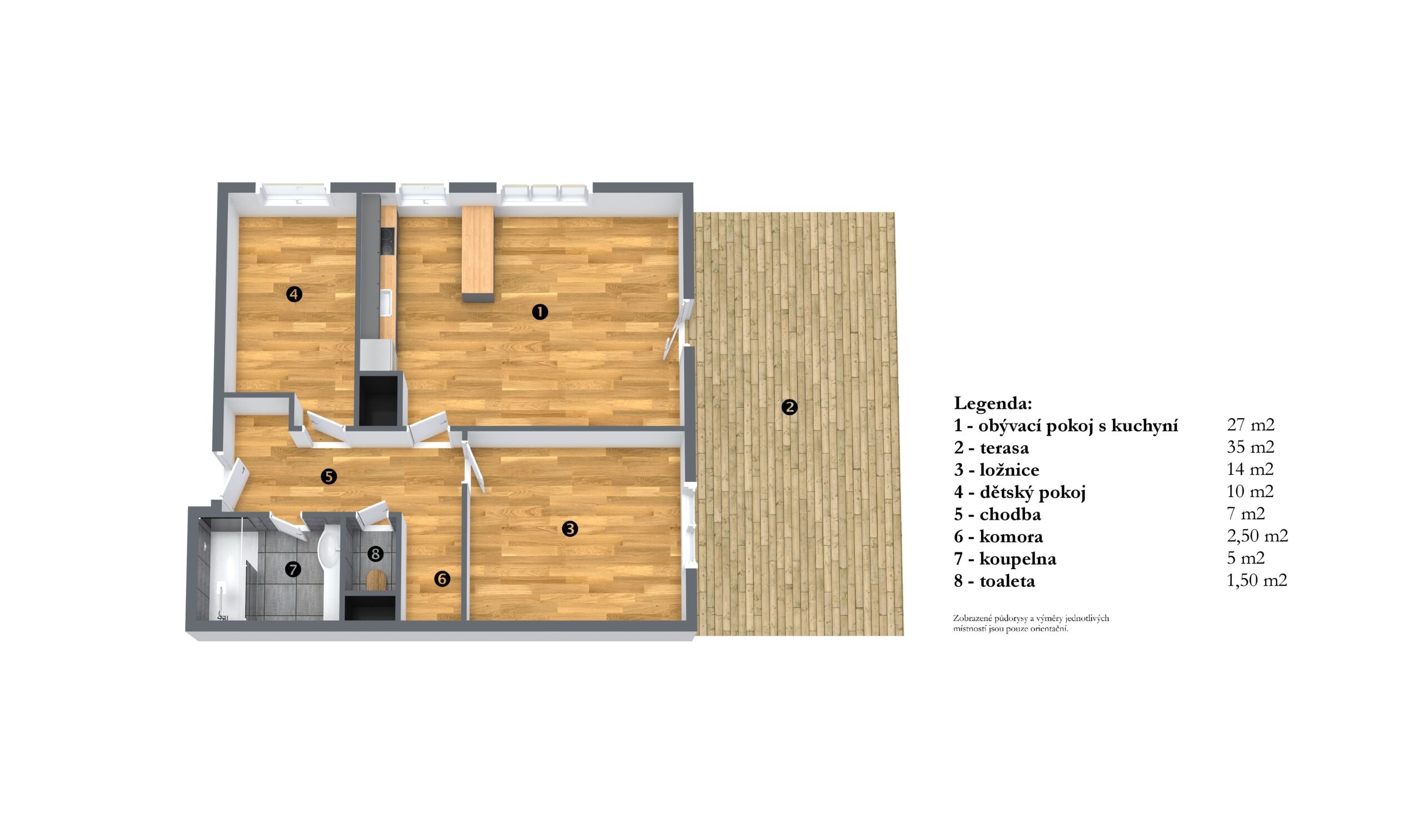 Dispozice: vstupní chodba, komora, obývací pokoj s kuchyní a vstupem na terasu, ložnice, dětský pokoj, koupelna se sprchovým koutem a samostatné WC.